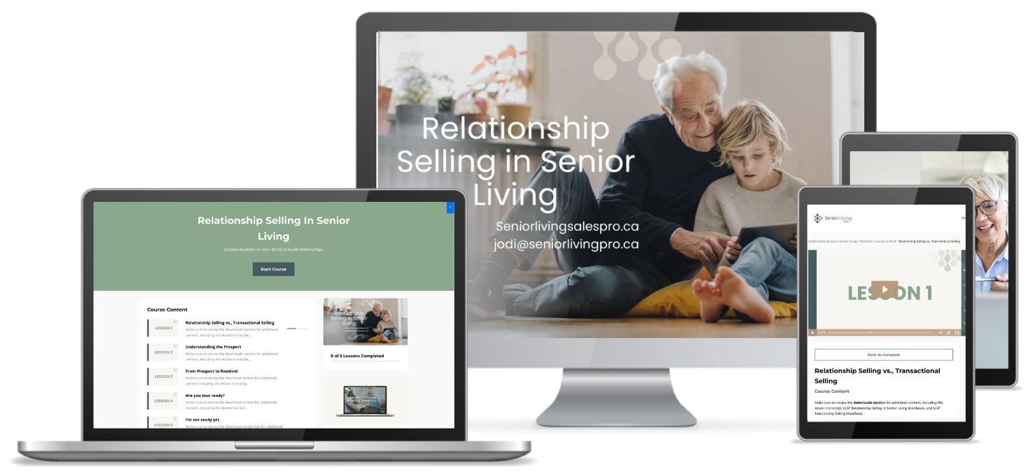 Relationship Selling In Senior Living is the foundation of all learning at Senior Living Sales Pro. Whether you are experienced or a brand new sales counselor, a General Manager, Department Manager, Regional Sales or looking to break into the industry, this course is for you.